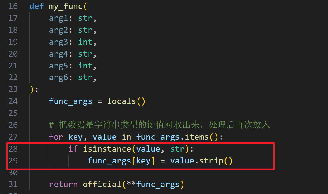 locals 函数获取所有参数的字典** 解包传参调用非常简单地解决了问题。不过这里注意,最好在函数一开始的时候就做这个事情。这是因为如果在执行 locals 之前,你自己在函数中定义了变量,那么也会保存在 locals 里面。