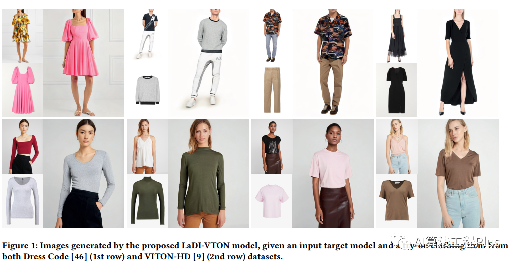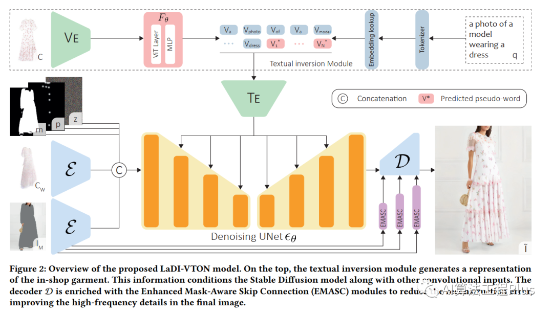 基于Stable Diffusion架构,为了增强文图生成模型虚拟试衣的能力,修改了网络结构使得输入为衣服和模特的姿态,同时为了保留衣服细节,提出了前向textual inversion,最后使用masked skip connections提升SD的图像重建自编码器,从而提高了图像生成质量且更好地保留了模特图的细粒度细节。