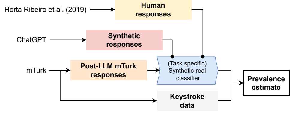 其中,首先使用真正的人工编写的MTurk响应和基于LLMs编写的响应来训练特定地分类器;其次将这个分类器用于真实的MTurk响应(工人可能依赖也可能不依赖LLMs),来估计LLMs使用的普遍性。在此过程中,作者根据收集到的真实MTurk响应和鼠标按键记录进行事后分析来确定该方法的有效性。