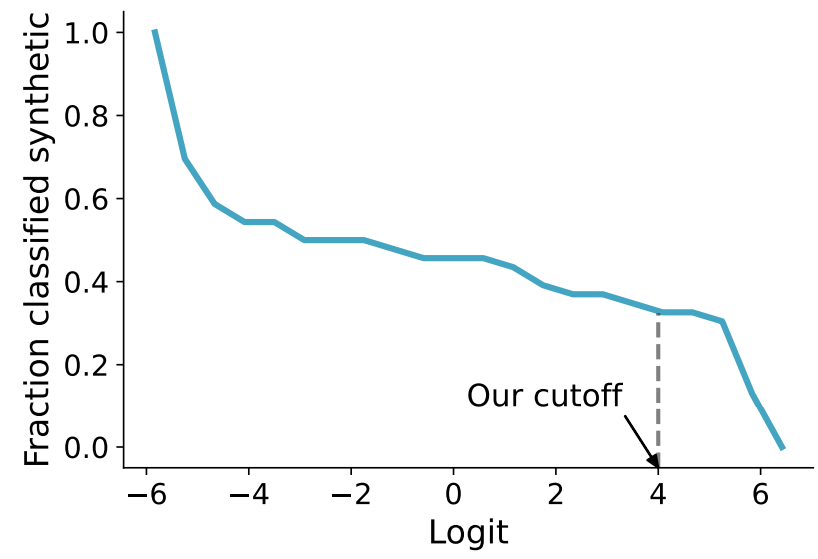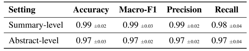 「合成数据检测」 在模型选择方面,作者「使用e5预训练模型作为合成检测的主要模型架构」,该模型使用对比损失进行了预训练,并在微调的分类设置中实现了强大的性能;在数据选择方面,作者使用了三个数据集训练分类器,所有这些数据集都源自或派生自相关的MTurk任务;在模型训练方面,作者在两个训练/测试设置中训练模型:抽象级拆分和摘要级拆分。其中在抽象级别拆分中,将摘要分为两个不相交的集合:12个用于训练和验证的摘要,4个用于测试,在摘要级拆分中,随机拆分真实和合成摘要数据集,利用75%的摘要进行训练,10%用于验证,15%用于测试。