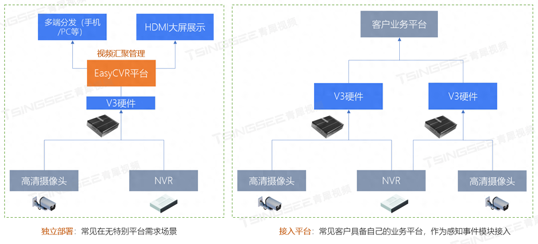 AI智能分析网关V3包含有20多种算法,包括人脸、人体、车辆、车牌、行为分析、烟火、入侵、聚集、安全帽、反光衣等等,可应用在安全生产、通用园区、智慧食安、智慧城管、智慧煤矿等场景中。将网关硬件结合我们的安防监控系统EasyCVR一起使用,可以实现多现场的前端摄像头等设备统一集中接入与视频汇聚管理,并能进行视频高清监控、录像、存储、检索与回放、AI智能分析、级联共享等视频能力与智能化服务。