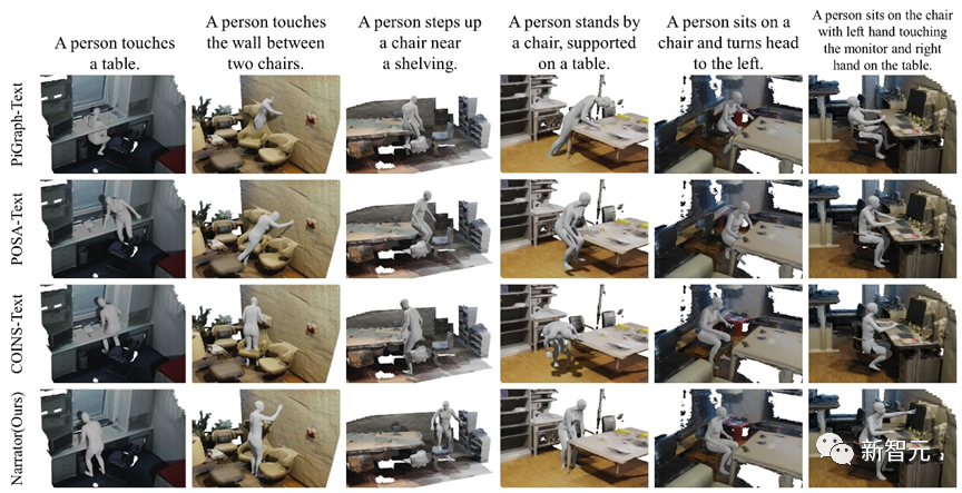 图3展示了Narrator与三种基线的定性比较结果。PiGraph-Text由于其自身表现形式的限制,存在更严重的穿透问题。