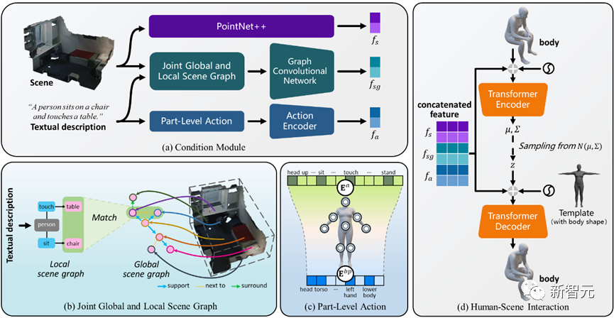 图1 Narrator可以自然可控地生成语义一致且物理合理的人与场景交互,适用于以下各种情况:(a)由空间关系引导的交互,(b)由多动作引导的交互,(c)多人场景交互,以及(d)结合上述交互类型的人与场景交互。