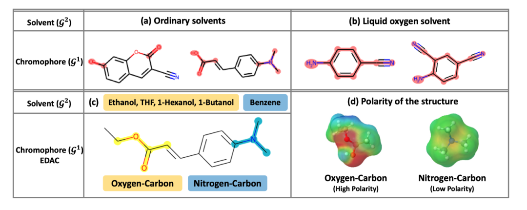 如图3,在对色团数据集进行定性分析时,CGIB预测到色团的边缘子结构在色团-溶剂反应中起着重要作用。这与化学知识相吻合,即化学反应通常发生在离子化的原子周围。此外,CGIB还根据溶剂的不同预测了色团的重要子结构变化,并解释了这种变化与化学极性和溶剂溶解性的关系。研究结果显示,CGIB能够提供对化学反应的令人信服的解释,验证了其在实际应用中的实用性。