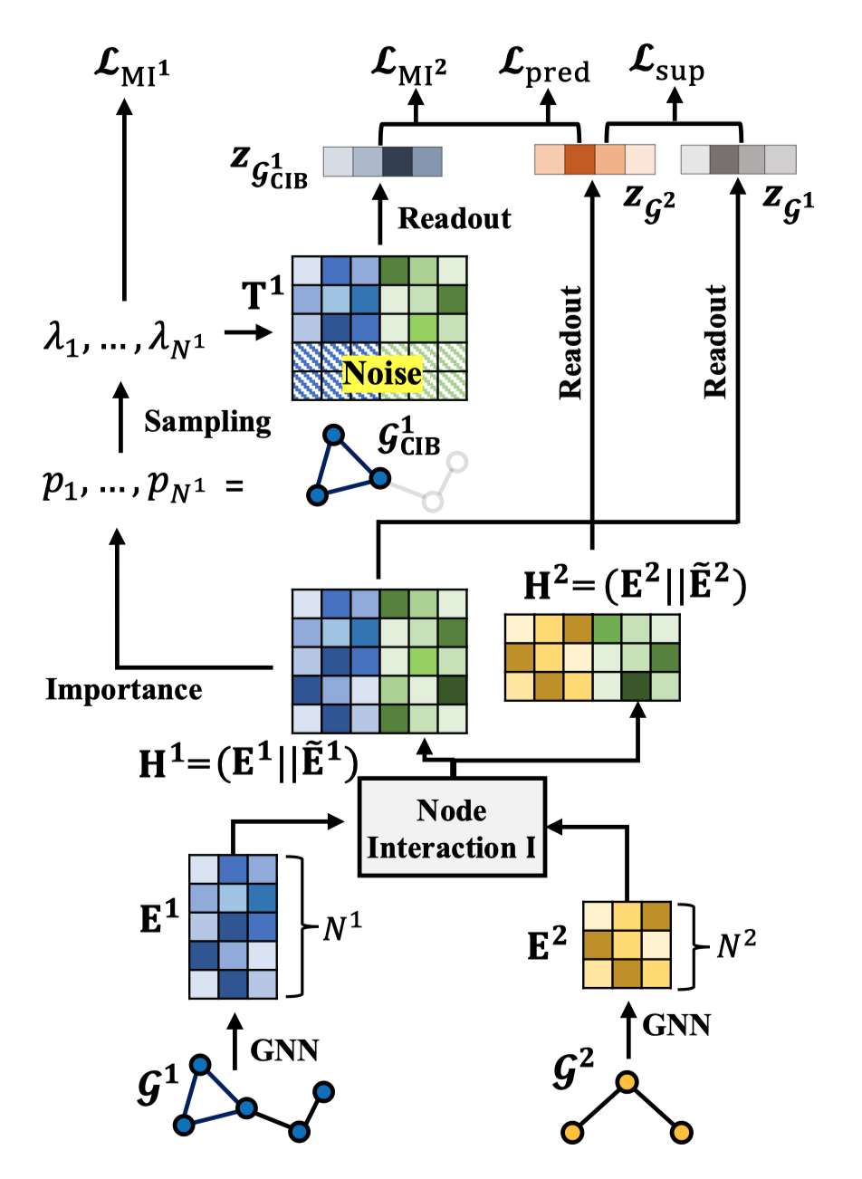 文章提出的方法称为CGIB,这是一种基于条件互信息的新颖关系学习框架,用于检测输入图的核心子图。如图1,对于一对图,首先使用GNN对齐进行编码。然后,通过一个交互映射I对G1和G2之间的节点级交互进行建模。然后,基于交互映射,计算嵌入矩阵˜E1和˜E2,每个矩阵都与其配对的图相关,计算方式为˜E1 = I · E2和˜E2 = I^T · E1,其中·表示两个矩阵之间的矩阵乘法。因此,˜E1是捕捉G1中节点与G2中节点之间交互的节点嵌入矩阵,˜E2也是类似的。然后,通过将E1和˜E1拼接在一起来生成G1的最终节点嵌入矩阵H1,即H1 = (E1 || ˜E1)。G2的最终节点嵌入矩阵H2以类似的方式生成。最后,使用Set2Set作为图读出函数,分别为每个图G1和G2生成图级别的嵌入zG1和zG2。