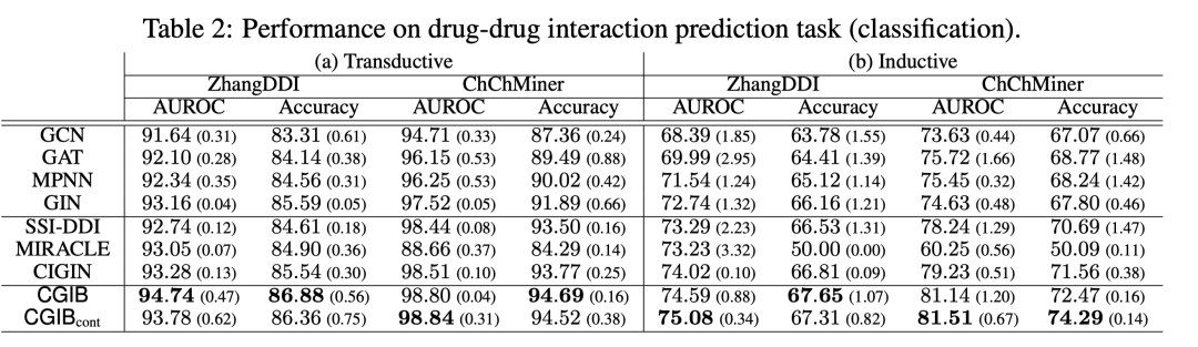 文章使用了十一个数据集来全面评估CGIB在三个任务上的性能,即:1)分子相互作用预测,2)药物-药物相互作用(DDI)预测,和3)图相似性学习。分子相互作用预测任务的性能以RMSE评估,药物-药物相互作用预测任务的性能以AUROC和准确率评估,相似性学习任务的性能以MSE、Spearman秩相关系数(表示为ρ)和precision@10(p@10)评估。CGIB在分子相互作用预测和药物-药物相互作用预测任务上的经验性能分别如表1和表2。
