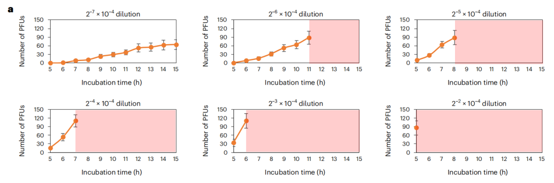 图5a:不同高浓度病毒样品在不同时间点的PFU计数结果。浅红色区域表示PFU聚集严重且不再适合计数