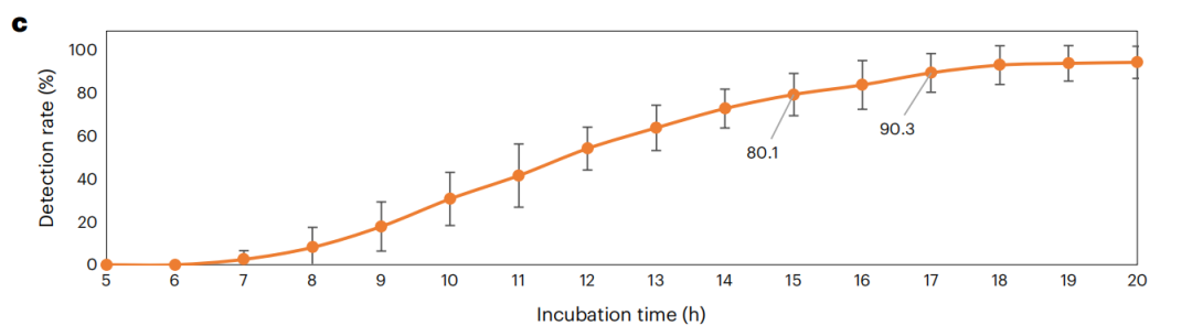 图3a显示了该设备在培养17小时后检测VSV PFUs的性能示例,显示了检出率超过90%的关键时间。