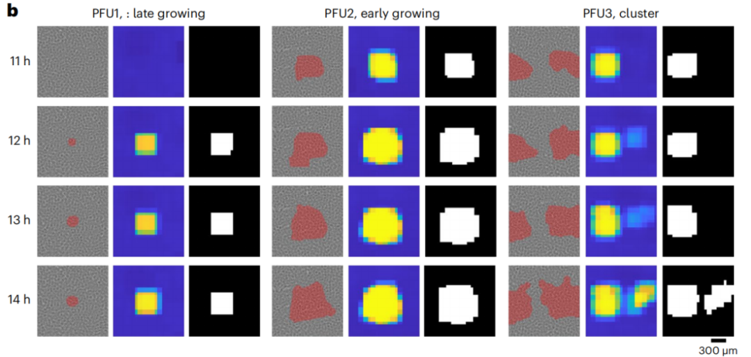 图3b:来自a的三个具有代表性的PFUs在阳性孔中的生长情况。重构的相位通道被覆盖上使用PFU定位算法生成的掩模,以更好地显示它们的位置。