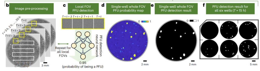 图2b-f:活病毒空斑测定的详细图像和数据处理步骤。b:重建和记录连续全孔全息图的图像预处理步骤。基于神经网络的PFU分类器以扫描方式将全息图转换为PFU概率图;c:本地区域的网络处理示例;d:单孔PFU概率图示例;e:采用0.5的阈值后,将d中的PFU概率图转换为PFU检测结果;f:全六孔板PFU检测结果示例。