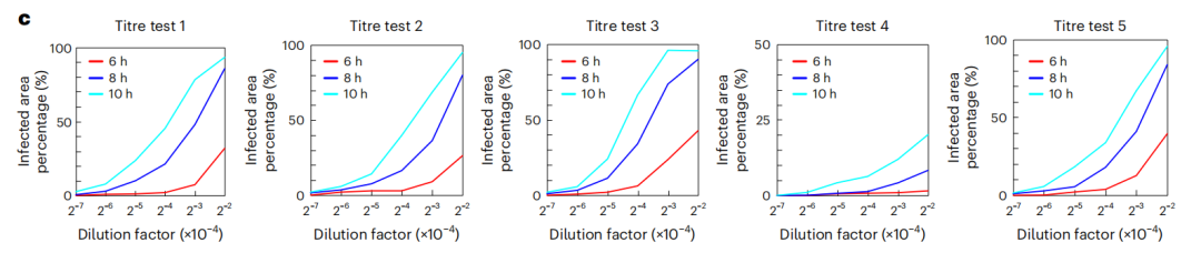 为了更好地说明这一点,如图5c所示,本文绘制了所有样品在6小时、8小时和10小时培养时间下的病毒稀释系数与每个测试孔感染细胞面积的比例(单位:%)。尽管存在一些序列稀释误差、后期病毒唤醒和PFU聚类事件,但在所有培养时间内,该装置测量的感染面积百分比随着稀释系数的增加而单调降低。这表明,通过校准系统,病毒浓度(PFU ml- 1)也可以从每孔感染细胞面积的百分比进行估计。