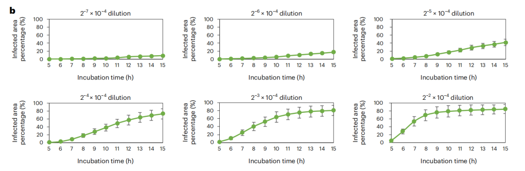如图5b所示,通过该装置的定量读数和PFU概率图,本文可以获得潜伏期内所有时间点的病毒感染区域面积。