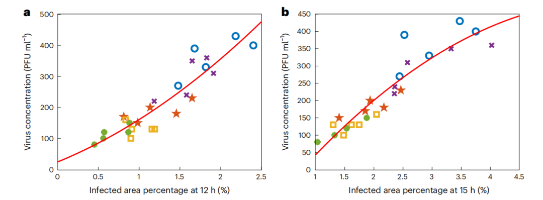 图6:无染色装置在不同时间点测量的感染面积百分比(%)与每孔病毒浓度(PFU ml-1)。a, b:12 h(a)和15 h(b)时的感染面积百分比。