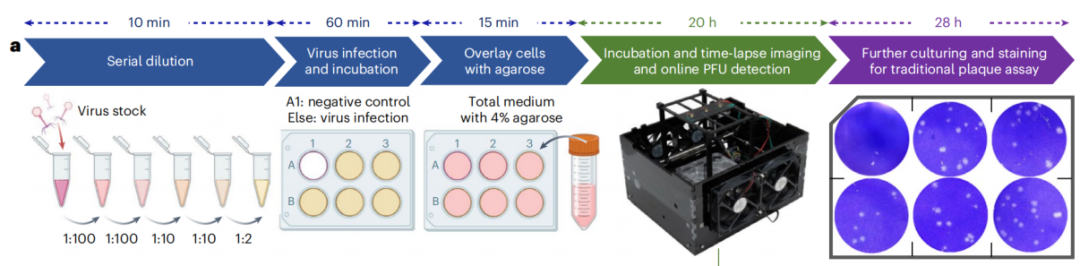 图1:利用深度学习和无透镜全息技术进行无染色、快速、定量的病毒斑块检测。a:无染色PFU成像系统的照片,该系统以每个测试孔每次扫描约0.32亿像素的吞吐量捕获斑块分析的相位图像;b:系统组件的详细说明;c:六孔板样品,盖上通气孔,侧面封上副膜。