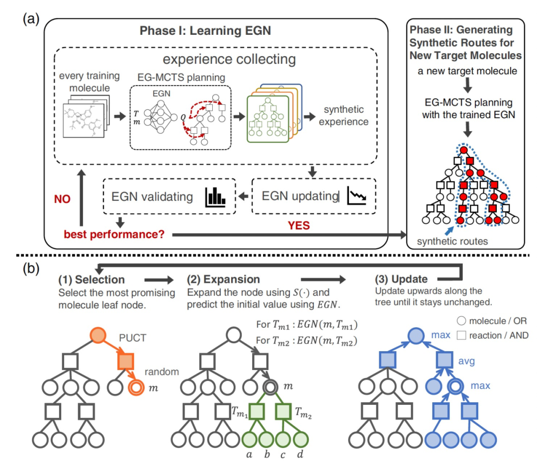 在图2a中展示的阶段I中,作者首先用随机权重初始化EGN。对于训练集中的每个目标分子,作者使用带有EGN的EG-MCTS规划构建搜索树,并根据搜索树收集合成经验作为EGN的训练数据。在获得新的EGN后,作者在验证集上验证其性能。如果达到最佳性能,阶段I停止并返回训练良好的EGN。否则,阶段I将按照经验收集、EGN更新和EGN验证的顺序循环进行。在阶段II中,作者使用它来引导EG-MCTS规划。在为一个新的目标分子生成搜索树后,作者分析搜索树中的合成路线。关键部分的EG-MCTS规划在阶段I和II中都出现,帮助收集合成经验和生成合成路线。EG-MCTS规划构建的搜索树被表示为一个AND-OR树。OR节点(分子节点)包含一个分子,而AND节点(反应节点)包含一个反应模板。规划过程可以从图2b中找到,它由三个模块组成,即选择、扩展和更新。选择模块选择最有前景的分子节点m,扩展模块使用单步反向合成模型扩展所选节点,并使用EGN预测初始值。之后,更新模块沿着树向上更新。这三个分子模块循环执行,直到搜索成本耗尽。