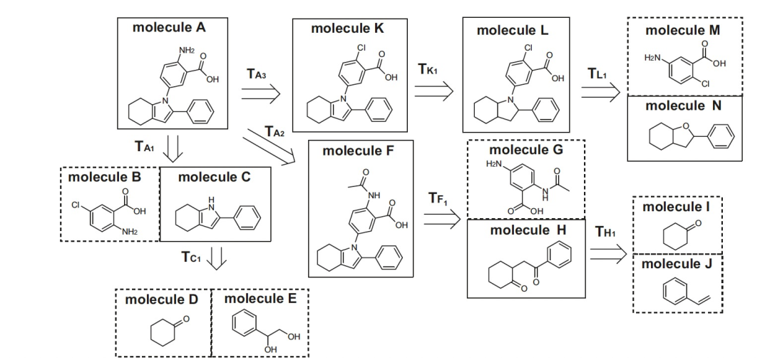 化学合成分析,即反向合成,旨在设计一条路径,使用一组可用的基元合成目标分子。反向合成任务具有挑战性,因为每一步可用反应的搜索空间非常大。已经有一些单步反向合成的方法,如基于模板的方法和无模板的方法,旨在预测目标分子的所有有前景的单步分解反应。基于单步反向合成,作者研究了多步反向合成问题,这是具有挑战性的,因为需要考虑多步实质性反应的各种组合。目前已经有工作提出了一些方法来解决这个挑战,通过构建评分函数来指导反应的搜索,这些评分函数可以是人工定义的或经过机器训练的。评分函数的作用是评估搜索状态的价值,例如预测分子的反向合成成本或应用于分解分子的反应。最近,Kim等人提出了一种自我改进的方法来增强现有的方法。为了简化,作者将这种增强方法称为Retro*+。还提出了基于强化学习的方法来构建评分函数,将反向合成问题的相似性与策略游戏的策略相结合。尽管先前的方法取得了成功,但它们所依赖的学习组件通常基于现有的单步反应数据库(如USPTO)。它们所能获取的知识主要取决于数据库的质量和数量。更重要的是,现有的数据库只包含单步反应。因此,目前的学习组件很难直接从中获取多步信息和知识。换句话说,构建一个基于路径级别和前瞻性的评分函数来准确预测分子或反应是具有挑战性的。