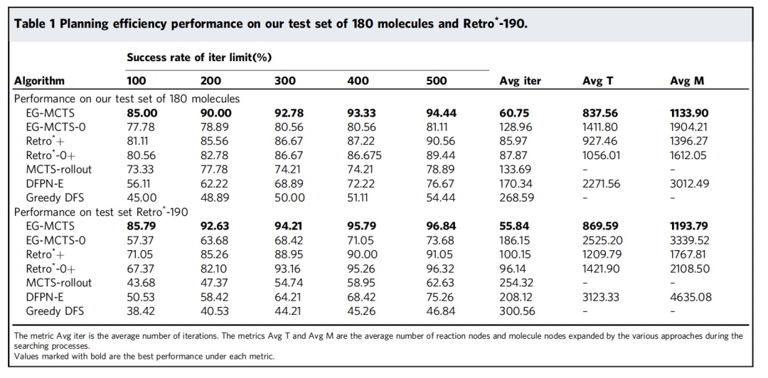 表1显示了所有方法在作者的测试集和Retro*-190上的规划效率表现。指标Avg iter、Avg T和Avg M均在迭代次数限制为500的情况下进行计算。在所有指标中,EG-MCTS在所有指标上的表现都比非学习版本要好得多,显示了作者的EGN所带来的性能改进。在作者的测试集中,EG-MCTS比次优方法Retro*+成功率高3.88%,比Retro*+少使用25.22次迭代。在Retro*-190中,作者的EG-MCTS在指标avg iter上也具有很大的优势。表1中迭代限制的成功率显示了迭代限制对这些算法的成功率的影响。可以看到作者的EG-MCTS在两个测试集上的表现都非常出色。作者在迭代限制为5000的情况下探索了EG-MCTS和Retro*+的性能。结果显示,两种算法的成功率收敛到相同的值(Retro*-190为98.42%,作者的测试集为96.11%),而EG-MCTS的平均迭代次数仍然低于Retro*+。从理论上讲,如果不限制搜索成本,任何搜索算法都可以找到可解的目标分子的解决方案。除了贪婪深度优先搜索(Greedy DFS)之外,在作者的测试集上有132个分子被所有方法成功解决,在Retro*-190上有103个分子成功解决。为了衡量解决方案路线的质量,作者比较了路线的长度,即路线中的反应数量。结果如表2所示。指标LRN(最长路线数量)表示某种方法在所有成功解决的分子中生成的最长路线数量。具体而言,对于所有方法成功解决的每个分子,如果某种方法生成了最长的路线,则该方法的LRN增加1。类似地,指标SRN(最短路线数量)表示某种方法在所有成功解决的分子中生成的最短路线数量。指标Avg表示每种方法生成的所有路线长度的平均值。