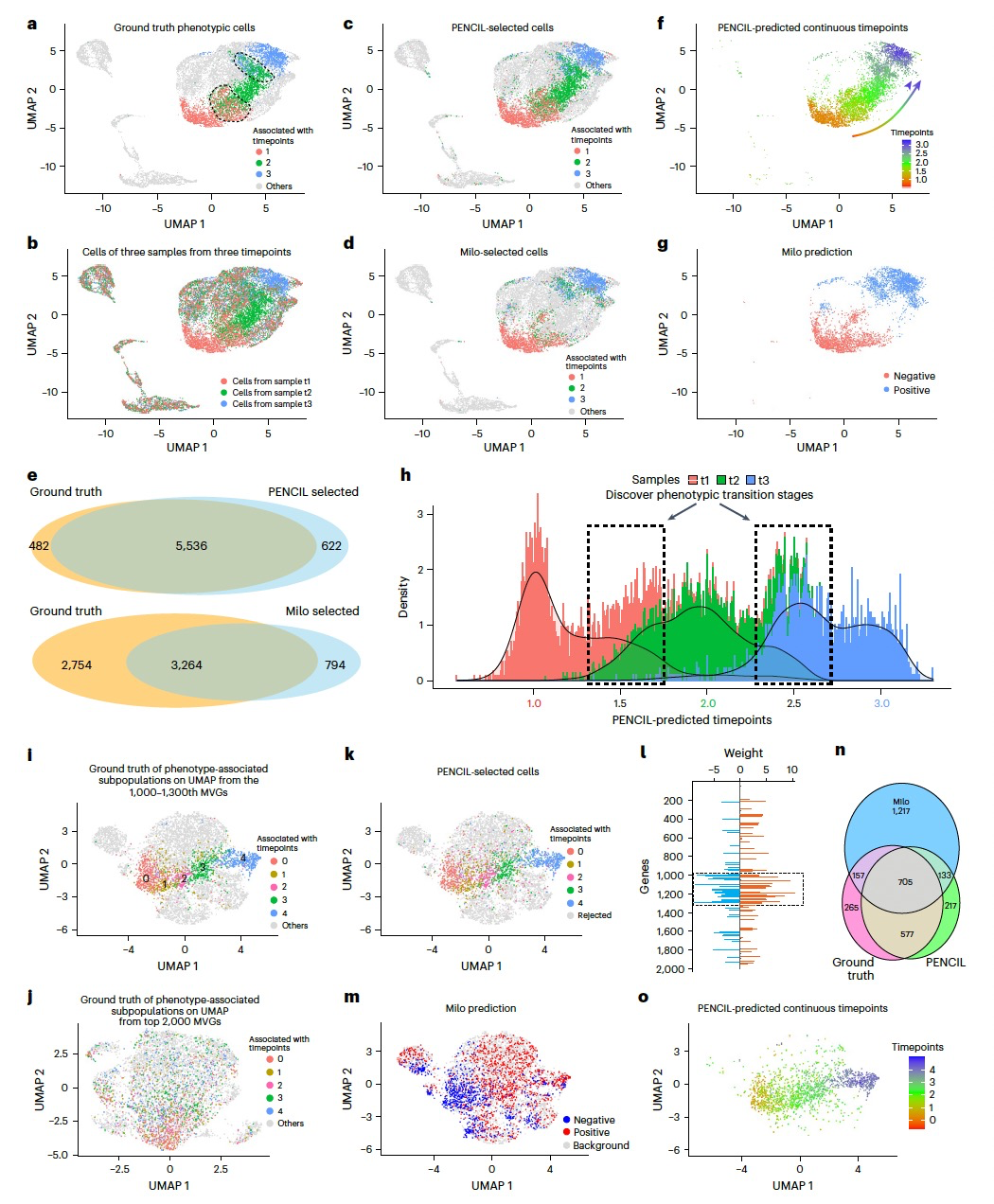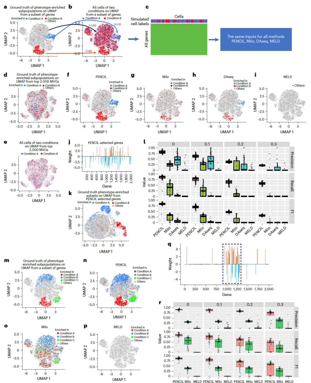 PENCIL可以接受分类的表型或连续变量作为输入。例如,图1h显示了一个模拟的单细胞RNA测序(scRNA-seq)数据集,其中使用前5000个最变量基因(MVGs)在Uniform Manifold Approximation and Projection (UMAP)中进行了二元表型标签。标准的基于前5000个MVGs的聚类分析无法区分包含在聚类0中的两个表型聚类(图1i)。相比之下,作者的PENCIL分类模式结合基因选择可以识别出这两个微妙的表型亚群,如基于PENCIL选择的基因的UMAP所示(图1j)。此外,通过将预测模块设置为回归器,PENCIL可以处理类似疾病阶段的连续表型标签,这与差异丰度分析执行的基本不同任务。例如,在模拟的双条件单细胞数据集中(图1k),基于类别的亚群识别方法(如Milo10)仅识别差异丰度的亚群(图1l)。有趣的是,基于回归的PENCIL可以重构表型轨迹,揭示在条件之间进行连续转变的亚群(图1m)。