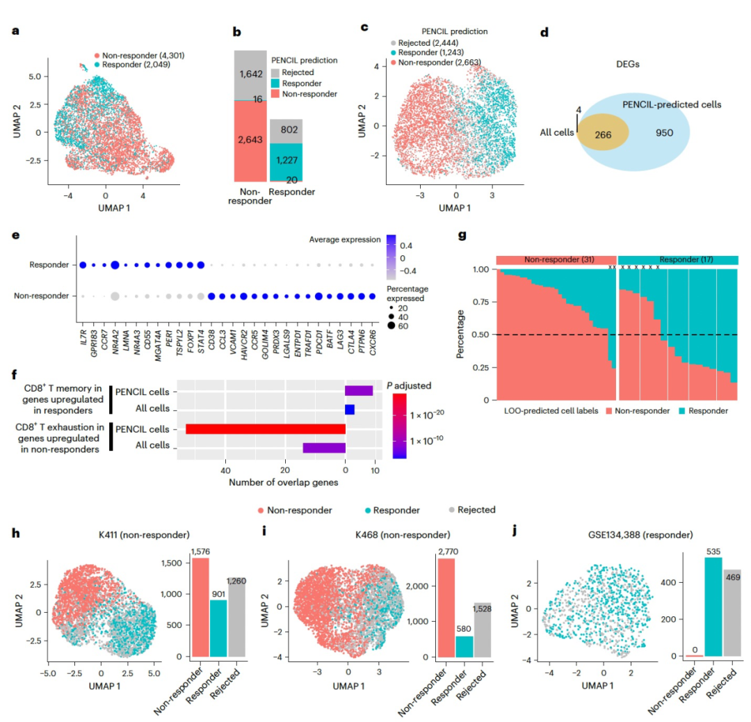 对于真实数据分析,作者首先将PENCIL应用于患有黑色素瘤的CD8+ T细胞scRNA-seq数据集(6,350个细胞),其中包括17个免疫检查点阻断治疗(ICB)的反应者和31个非反应者(图4a)。针对ICB治疗结果表型,基于分类的PENCIL识别出与非反应者相关的2,663个细胞和与反应者相关的1,243个细胞(图4b)。同时,PENCIL选择了88个信息丰富的基因。基于这些选定的基因,UMAP显示了PENCIL选择的细胞的明显聚集模式(图4c)。为了记录ICB结果背后的转录模式,作者在与ICB反应和耐药相关的两个亚群之间执行了差异表达基因(DEG)分析。这项分析揭示了PENCIL选择的表型亚群之间的1,216个DEG(图4d),其中包括除了原始的所有反应者与非反应者细胞之间的DEG之外的950个新的DEG(图4d)。这些独特于PENCIL的DEG富集在与CD8+ T细胞相关的200多个通路中。值得注意的是,与ICB反应者相关的亚群具有与T细胞记忆和存活相关的基因的较高表达,例如IL7R,CCR7,LEF1,SELL和TCF7(图5e、f)。相反,与非反应者相关的亚群表达与T细胞衰竭和功能障碍相关的基因,例如TOX,LAG3,PDCD1和CTLA4(图5e、f)。此外,与其他策略不同,基于LWR的监督学习框架在另一个独特的用途是,训练好的PENCIL模型可以直接用于预测新单细胞样本的细胞表型。为了展示这个功能,在同一个包含48个样本的数据集中,作者进行了一次留一患者(LOPO)评估。在这种方法中,来自47个患者的细胞被用于训练PENCIL模型,然后该模型被用于预测被排除的患者的细胞表型。这种基于单细胞级别的表型预测进一步用于通过比较与两种表型相关的细胞数量来推断患者级别的表型(补充图2)。然后,如果预测为反应者细胞的细胞比例超过50%,作者将每个“被排除的”患者视为反应者,并将此状态与实际的临床注释进行评估。结果显示,基于PENCIL的单细胞级别预测所进行的患者级别推断在48个样本中正确确定了40个ICB结果(图4g),并在LOPO评估中达到了0.935,这与原始研究中的48个样本相当。此外,鉴于在这个T细胞黑色素瘤ICB数据集上训练的PENCIL模型,作者将其应用于三个已知ICB反应状态的黑色素瘤患者。PENCIL排除了不相关的细胞并预测了所选细胞的表型(图4h-j)。然后,通过比较PENCIL预测的两种条件下表型细胞的数量,模型正确推断了这三个新样本的患者级别ICB结果(图4h-j)。