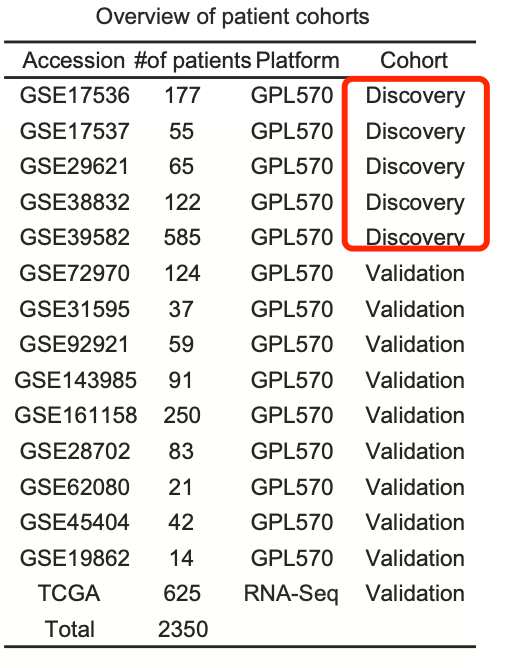 既然这些细胞状态组合情况以及多细胞群落情况,在肿瘤里面是跟预后会有关系, 那么毫无疑问,每个癌症都是可以做同样的数据分析啦。比如2023年7月的文章:《Deep immunophenotyping reveals clinically distinct cellular states and ecosystems in large-scale colorectal cancer》就是收集了14个GEO数据集1725个CRC样本和TCGA的625个样本,样品数量很大,如下所示:
