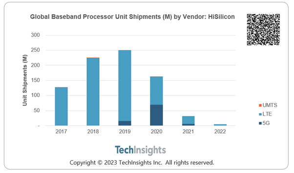 TechInsights的数据显示,海思基带处理器芯片的出货量在2019年达到了2.5亿的峰值,仅次于高通、联发科和紫光展锐,排名第四,领先于当时为苹果iPhone提供调制解调器的三星和英特尔。
