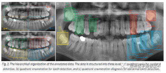 DENTEX 提供了三个分层注释的数据集,可促进各种牙齿检测任务:(1) quadrant-only 用于象限检测,(2) quadrant-enumeration 用于牙齿检测,(3) quadrant-enumeration-diagnosis 用于异常牙齿检测。尽管提供象限检测数据集似乎是多余的,但它对于利用 FDI 编号系统至关重要。FDI 系统是一个全球通用的系统,它为嘴巴的每个象限分配一个从 1 到 4 的数字。右上角为 1,左上角为 2,左下角为 3,右下角为 4。然后每个八颗牙齿和每颗臼齿的编号分别为 1 到 8。1 从前面的中间牙齿开始,越往后数字越高。因此,例如,根据 FDI 符号,左下侧的后齿为 48,即第 4 象限,
