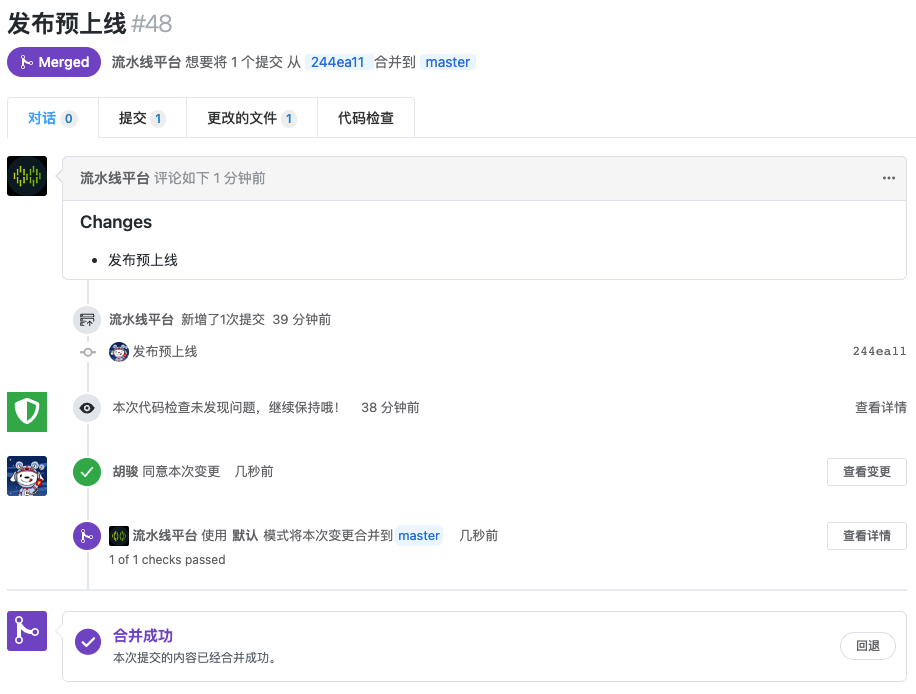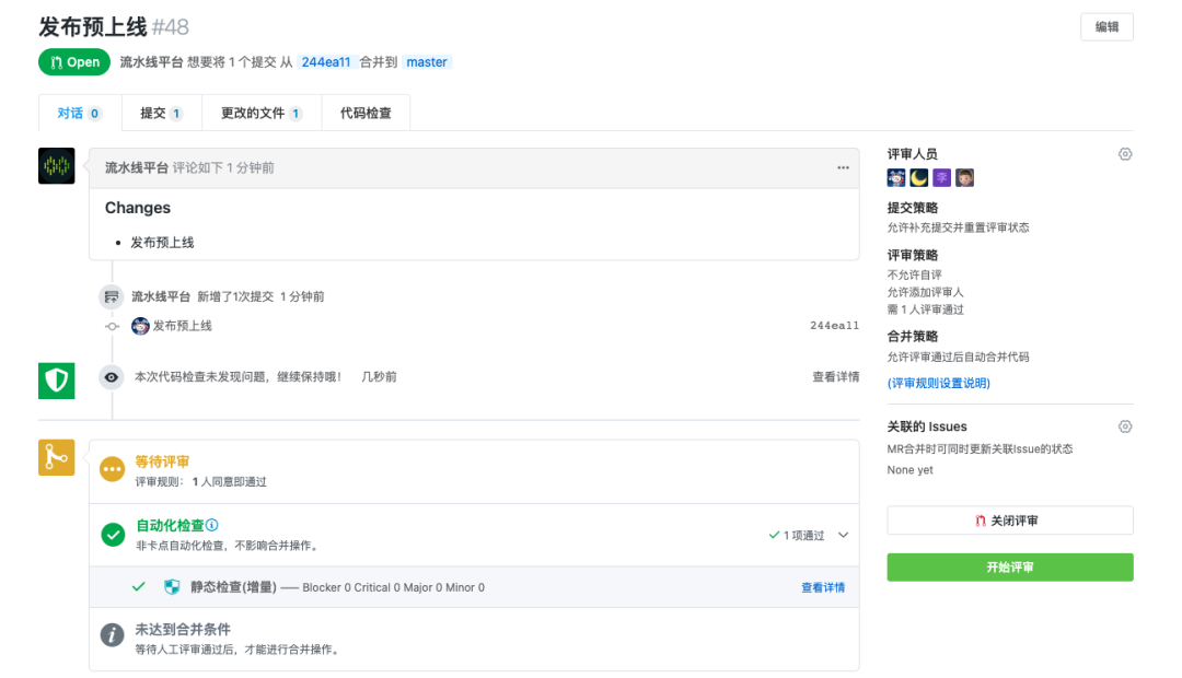 为避免评审过程中的等待时间浪费,当评审通过分支合并成功后,自动触发预上线部署的流水线。