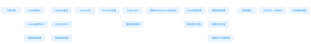 下图团队设计的前端DevOps自动化流水线,目的是打破开发、测试、产品、运营等不同岗位人员的沟通壁垒,让研发团队人员同时具备不同研发环节的能力,从而实现项目研发全流程的无缝集成。
