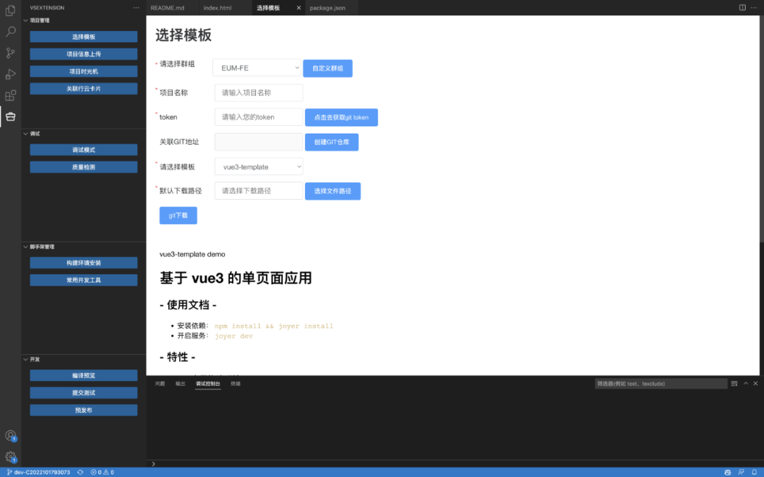 VSCode代码编辑器插件,集成了模板,调试,提测,预发布等功能。让前端开发者更关注代码实现而简化项目初始化和项目进程流转。