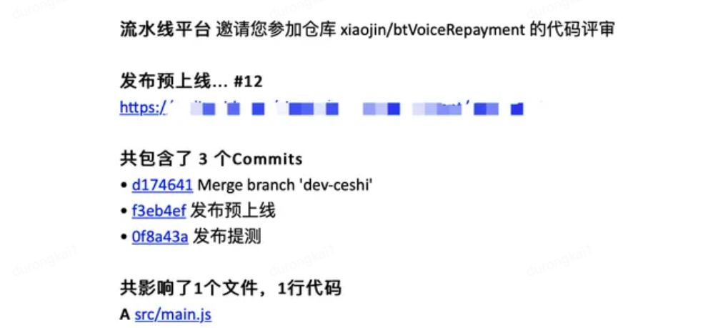 当分支代码没有进行评审时,评审人员会收到代码评审的咚咚和邮件通知,以此提高代码质量的管控,进一步降低沟通成本。