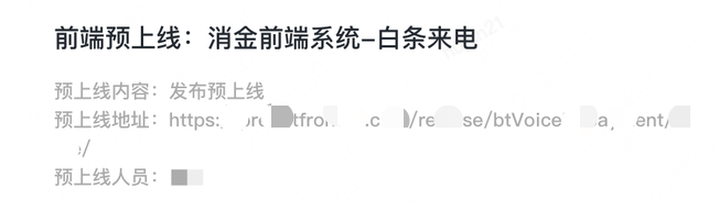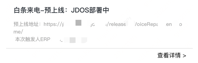 全部勾选确认后,会自动执行预上线部署流程的阶段二(JDOS部署),并推送咚咚通知,如下图所示。
