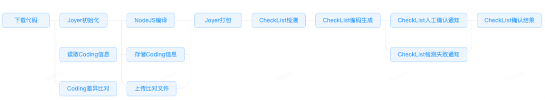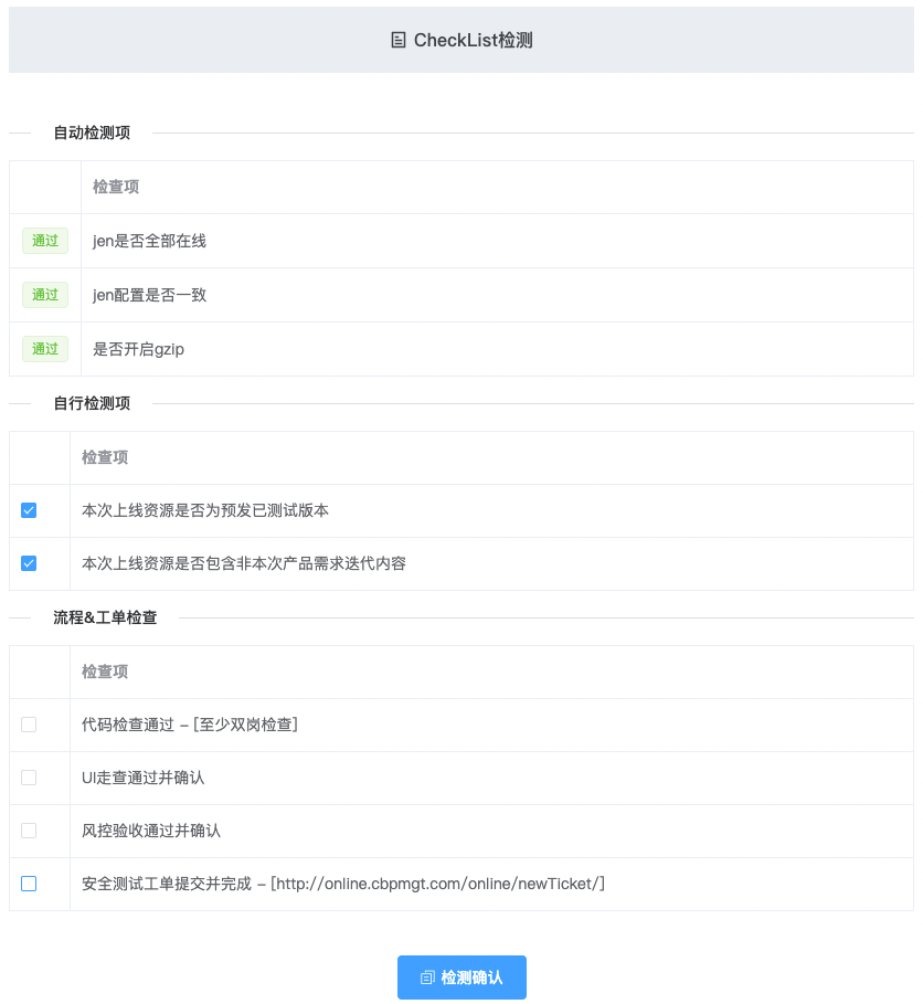 阶段一进行编译打包后,设置了代码自测(CheckList)的流程卡点,目的是提醒前端开发者最后检查一些风险事项,并确认提交,如下图所示。
