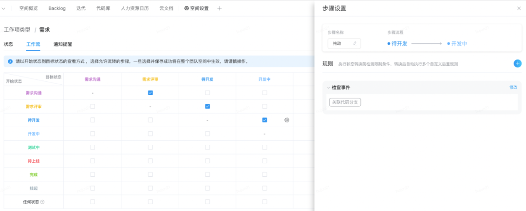工作流转到开发阶段,未关联代码分支会进行弹窗提示去关联代码分支,不关联将无法进入开发阶段。