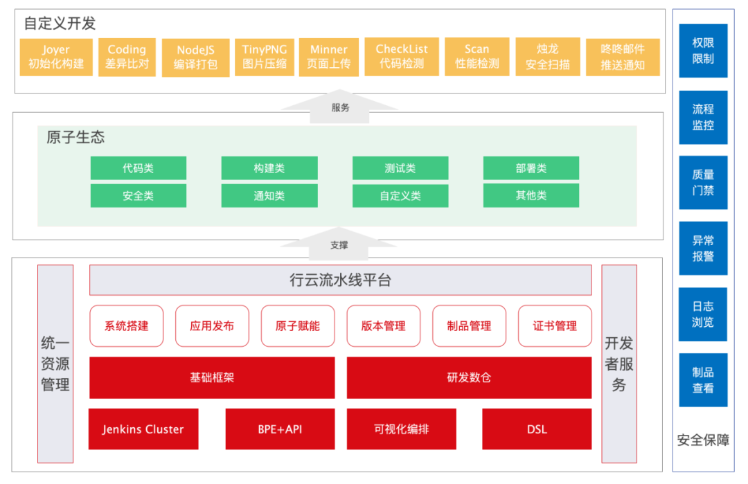 行云流水线采用了平台化管理+原子化设计+自定义开发模式,平台提供基础服务,能力可以通过原子化形式和自定义开发模式无限扩展,即兼顾了平台的稳定性,又大大减低了现有工具平台的接入成本。既有工具平台可独立对用户提供服务,也可以通过标准化方式输出插件化原子能力,作为持续交付平台的一环,纳入软件交付流程中,实现互利共赢、完美对接,减少重复建设,共建平台。