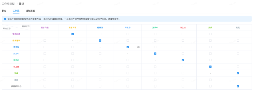 行云团队空间设置里,将工作流设置为阶段串联且不可跳过阶段和回撤,这样的好处是便于约束研发流程的各个阶段逐一流转,并有效地计算各阶段的投入成本。