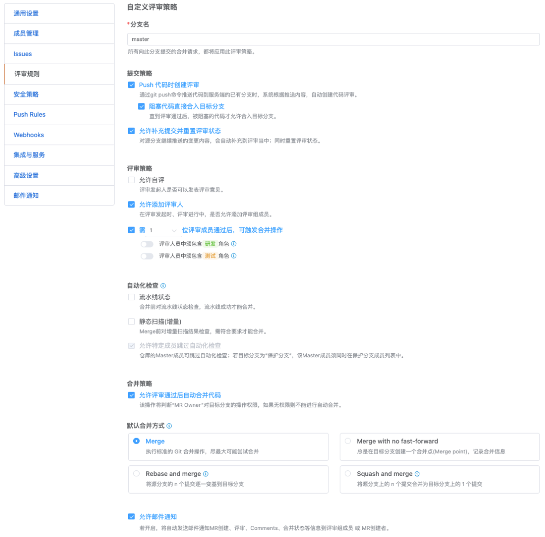 为进一步提高代码质量,降低潜在风险,在Coding平台制定了评审策略,只有代码评审通过才可以进行合并主干的操作,如下图所配置。