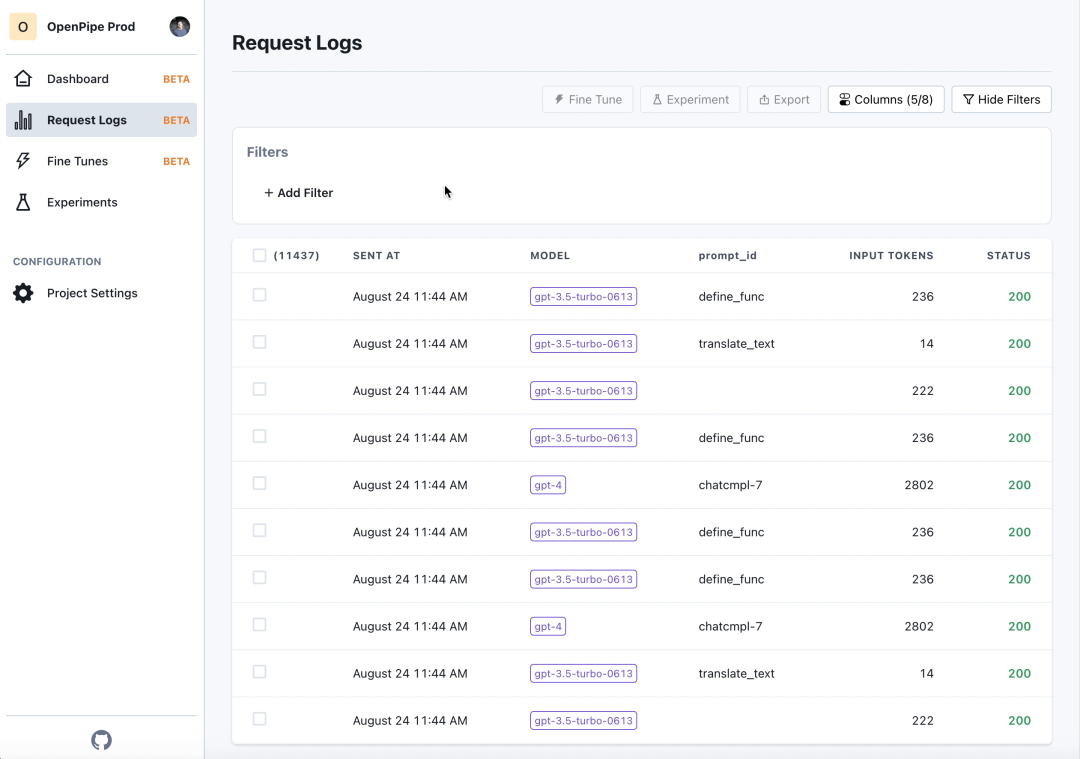 - 微调 (Beta 版):在 Python 和 JS 中轻松集成 OpenPipe SDK,并通过直观内置过滤器快速查询日志。
