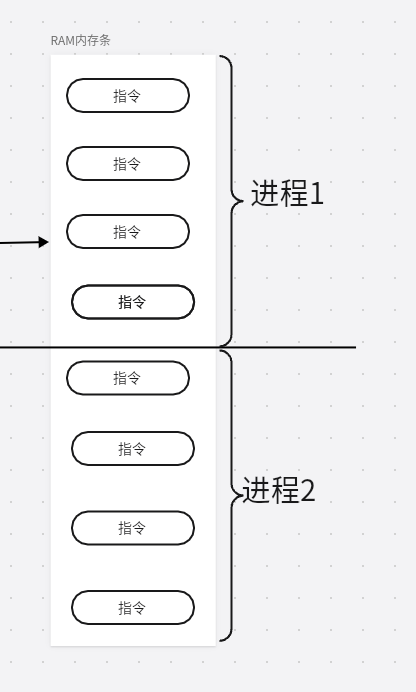 进程1运行到指令2的时候,分配给进程1的时间片到了,此时该运行进城2了,把当前进程1的上下文数据保存到当前进程内存的PCB区域;接着恢复进程2地址空间中上次保存的PCB数据运行,也就是读取进程2内存的PCB区域赋值给寄存器,栈 再运行。
