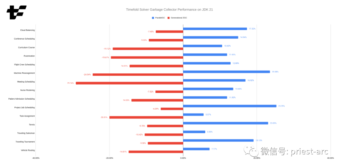 下图展示了 G1GC(基线)和 ParallelGC 之间的性能差异。由于 Java 21 引入了代级 ZGC,这是另一种旨在实现低延迟的垃圾收集器,我们认为将其纳入比较范围也会非常有意义。