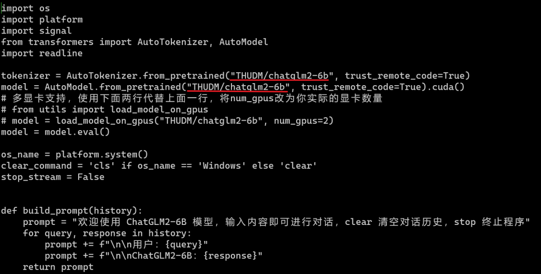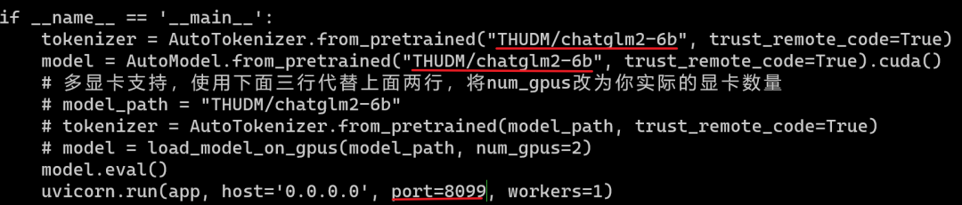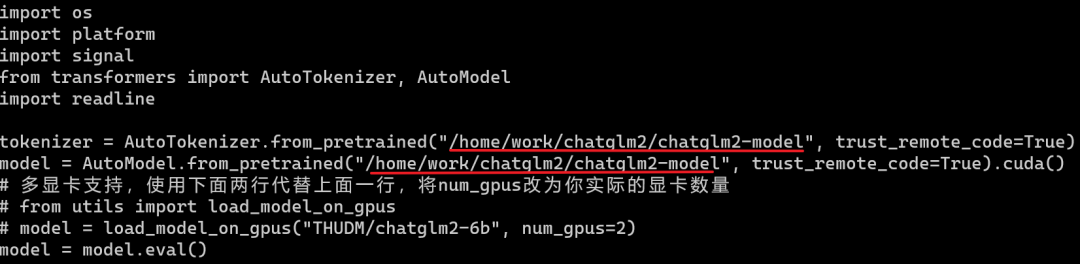 具体地,将上面的“THUDM/chatglm2-6b”修改成自己的模型文件路径,我们这里模型路径是在:/home/work/chatglm2/chatglm2-model,修改之后结果如下: