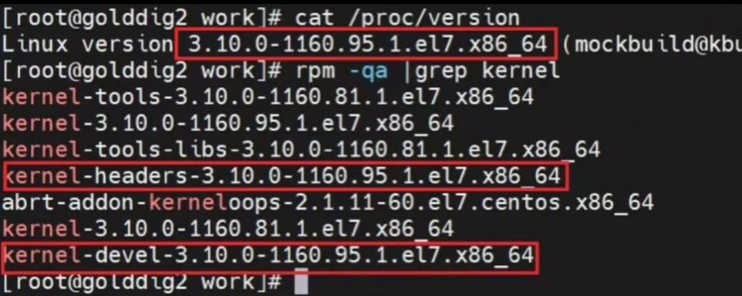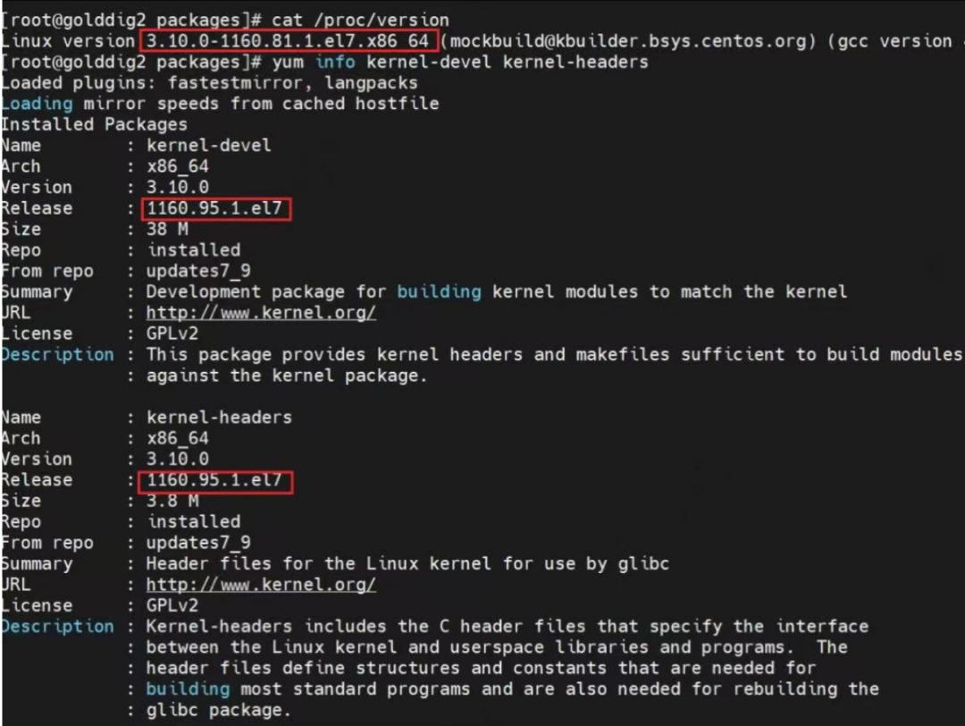 可以发现,服务器运行的内核编号和kernel-devel、kernel-headers的版本编号并不一样。这个时候有两种做法,一种是让服务器的内核版本编号与kernel-devel、kernel-headers版本编号对齐,另外一种是让kernel-devel、kernel-headers的版本编号与服务器系统运行的内核编号对齐。