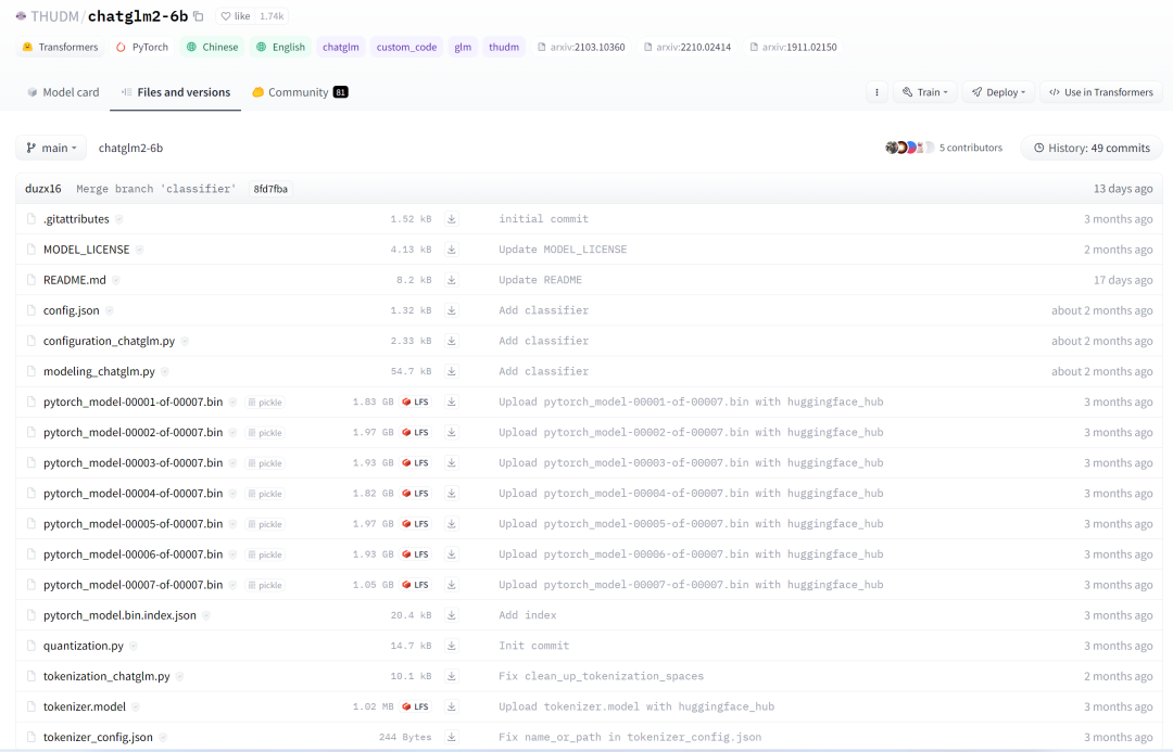 2、授之以渔(非必须) 模型文件是在https://huggingface.co/THUDM/chatglm2-6b/tree/main下载得到,具体截图如下: