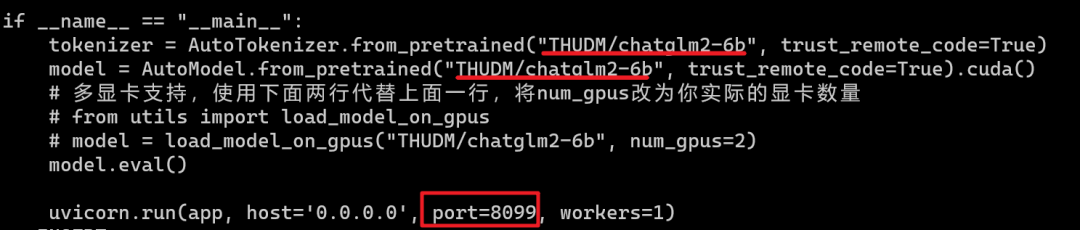 1、进入到/home/work/chatglm2/chatglm2-web下面,修改api.py的文件,更改模型文件路径,如若要修改服务端口,可以在下面修改port参数,这里修改成了8099端口。
