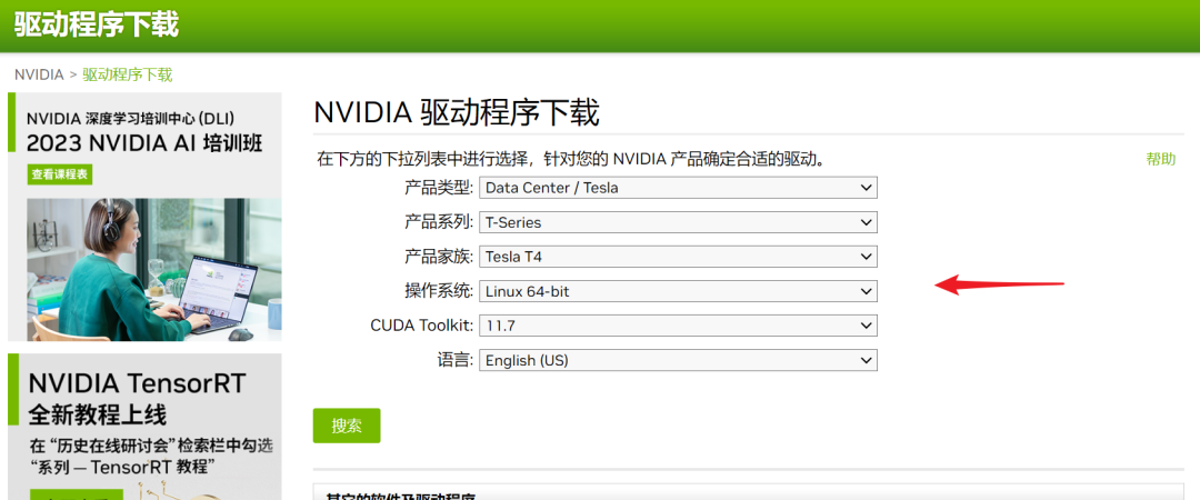 访问英伟达官网:https://www.nvidia.cn/Download/index.aspx?lang=cn,根据自己显卡的系列型号,选择对应的版本,进行下载。如下图所示: