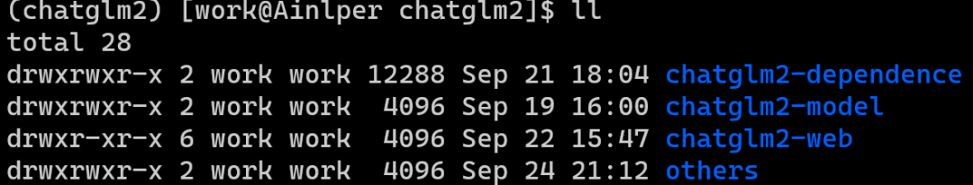 1、将chatglm2的模型文件:chatglm2-model,拷贝到:/home/work/chatglm2/下面。如下图所示