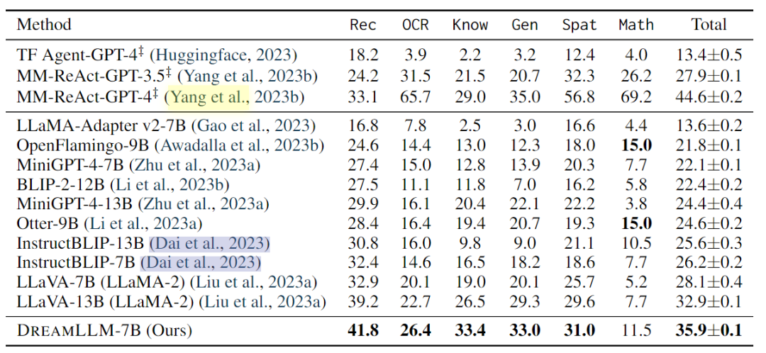 发现,DREAMLLM在所有基准测试中都优于其他MLLM。值得注意的是,DREAMLLM-7B在图像合成能力方面大大超过了并发MLLMs,与Emu-13B相比,VQAv2的精度提高了16.6。在MMBench和MMVet等综合基准测试中,DREAMLLM与所有7B同行相比都取得了最先进的性能。