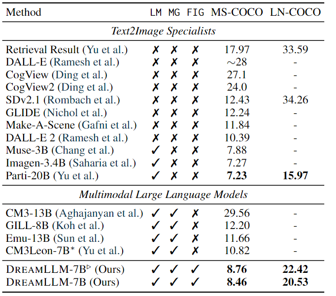 其结果如上表所示。结果显示:DREAMLLM 在阶段I对齐后显示出比Stable Diffusion基线显着提高FID,在 MS-COCO 和 LN-COCO 上分别将分数分别降低了 3.67 和 11.83。此外,预训练和监督微调后实现了 3.97 和 13.73 的 FID 改进。LN-COCO 的实质性改进强调了 DREAMLLM 在处理长上下文信息方面的卓越性能。与之前的专家模型相比,DREAMLLM 基于 SD 图像解码器提供了有竞争力的结果。DREAMLLM 始终优于基于并发 MLLM 的图像合成方法。