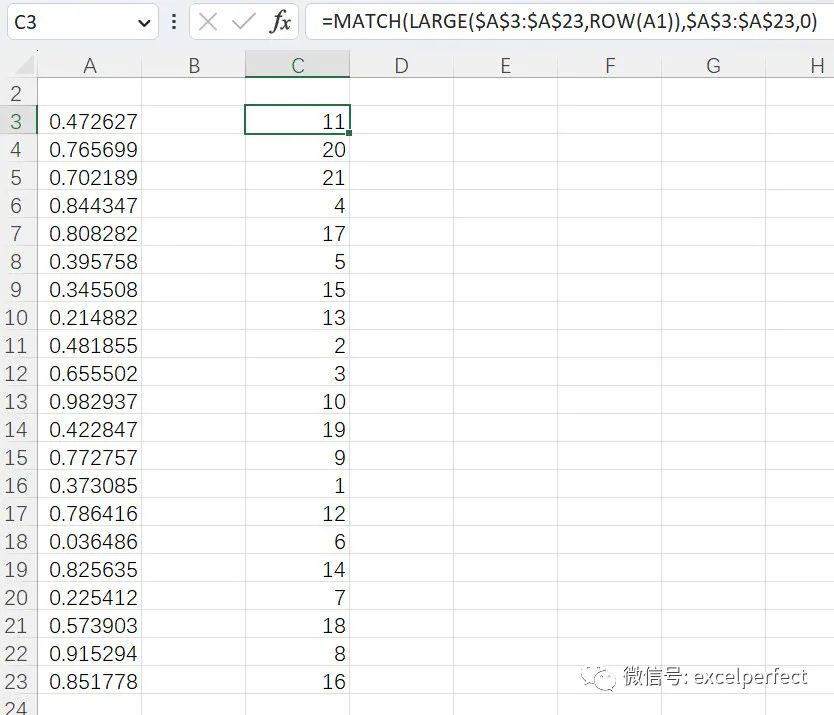 =MATCH(LARGE($A$3:$A$23,ROW(A1)),$A$3:$A$23,0)