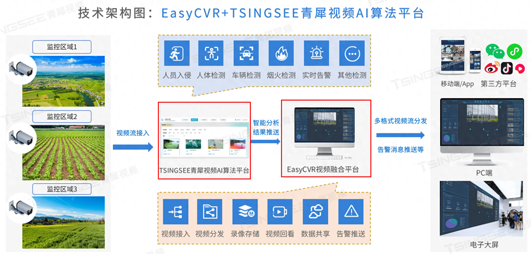 TSINGSEE农场综合智慧安防解决方案包含安防视频监控系统EasyCVR与TSINGSEE青犀AI算法平台,部署摄像头并覆盖农场周边、内部道路、制高点等重点区域,采用更为便捷的联网/供电方式,减少布线难题。视频监控系统EasyCVR平台可以实现24小时高清智能可视化远程监管,借助AI算法可以及时感知入侵事件并实时告警,减少农场盗窃破坏现象,助力农场科学化管理,给农场的主人更安心的守护。