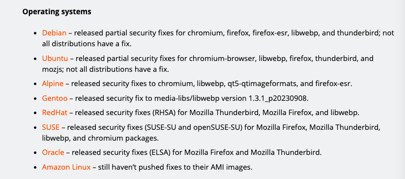 1Password for Mac 已发布更新来解决该问题。Telegram Desktop 进行了更新,并且 Ubuntu、Debian、SUSE 和其他 Linux 平台也在积极更新其 libwebp 版本。